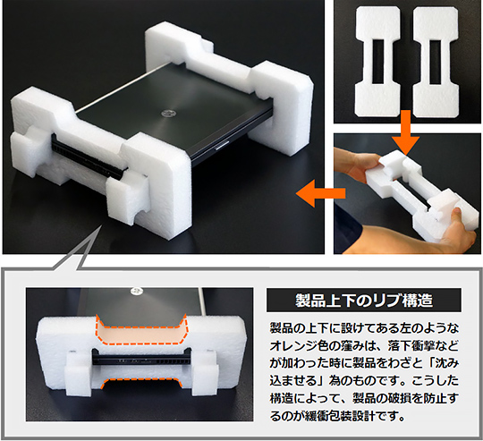 しっかりした構造で緩衝性能を担保しつつ、製造ラインでの組み立て工数を最小限に抑える為、今回は敢えて、当初の素材である段ボールをやめ、高機能緩衝材であるサンテックフォームをご提案。下図のように、平たい保管時の形状から、指先で軽く押し出すだけの簡単操作で、使用時の形状(写真左の大きな画像)へと変形します。下の吹き出しの中でご説明しているように、落下衝撃を受けた時に、その衝撃を内部で相殺する為、製品が沈み込める空隙をしっかり設けている点なども、段ボールではなかなかできない、フォーム材ならではの緩衝構造です。