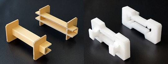 今回はノートPC用緩衝材の改善事例。上記画像の左写真が、現行の段ボール製サイドパッドです。シンプルな造りでコストパフォーマンスは良好でしたが、簡易な構造ゆえ、落下試験で脆さが露呈し、製品への許容G値を上回ってしまう結果に。お客様からは、「素材は段ボール仕様のまま、緩衝性能を高めて欲しい(但し、緩衝材組立時の作業工数は出来る限り低減したい)」とのご要望が。しかし…。
