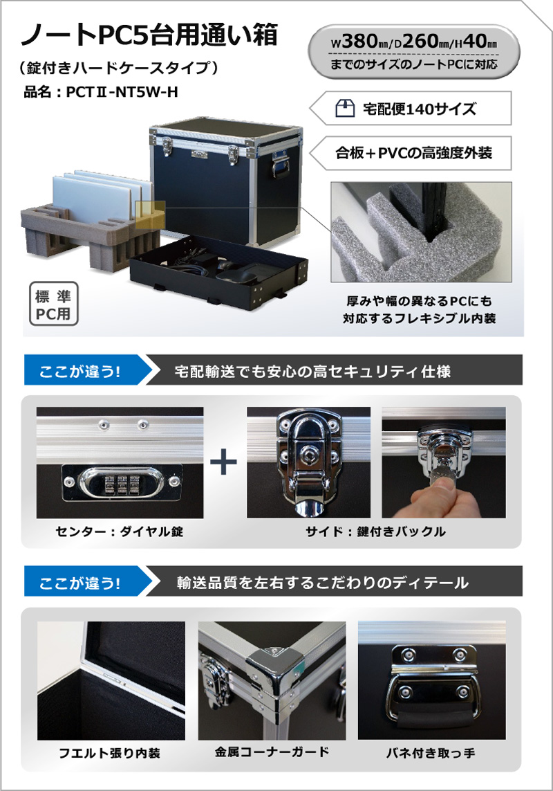 ノートパソコンの輸送用ケースとして永くご愛顧いただいている「パソコンテナー」に、新たにハードケースタイプが加わりました。信頼性の高い国内メーカーによる、合板とPVCの複合素材仕上げで高い耐久性を担保。また、上蓋にはセンター・左右の合計3か所にロック機構を施し、イベント会場への宅配輸送などにも安心のセキュリティ性。高機能緩衝材である「サンテックフォーム」製内装材に、国内老舗外装メーカーならではのこだわりディテールをプラスして完成しました。